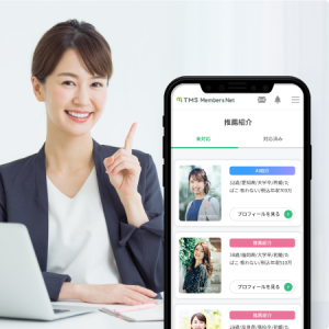 TMSメンバーズネットシステムでは、お相手検索や気に入ったお相手への「お気に入り」、セミナー・パーティー情報など様々な婚活をすることができます。自宅にいながらお相手を探すことができるので、日常の行動範囲では出会えない方とのご縁をつなげることができます。